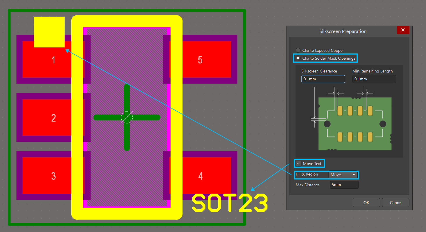 Move Text:在有文本字符串情況下,進行勾選。可以將絲印文本字符串從銅層/阻焊層重疊移開。移動受【Max Distance】值的約束。