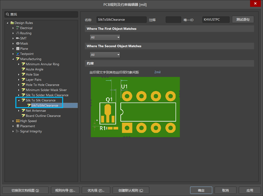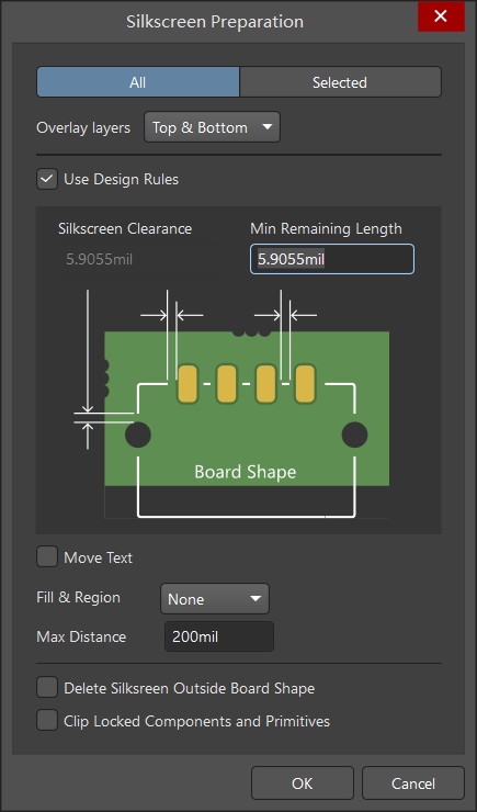 第一欄:設置即是將絲印制備適用于哪些元素對象的選擇,【All】選項為所有對象,【Selected】選項為僅在設計中選擇的對象,此處一般默認【All】適用于所有對象設置。