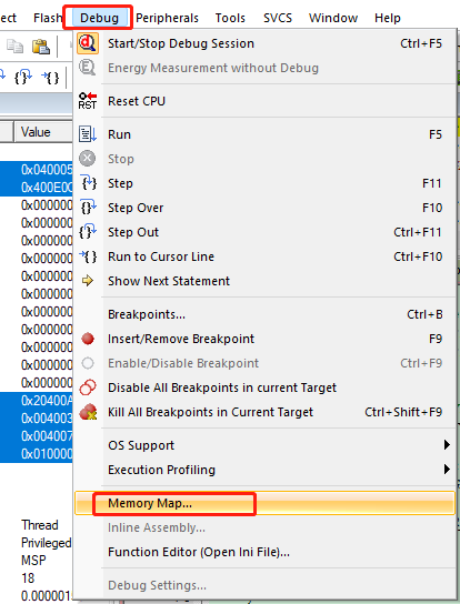 1)、進入到debug模式下,找到Debug->Memory Map。(如圖4-1)