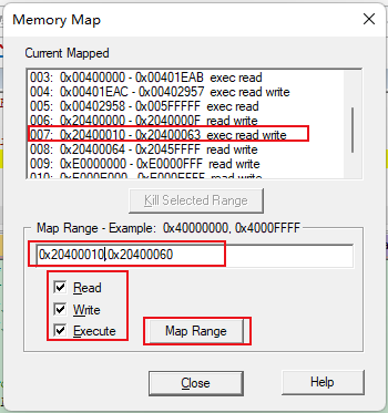 3)、如果想要設置某一個內(nèi)存范圍的權限,可以在Map Range下面的輸入框中對應的內(nèi)存范圍。然后,可以通過勾選下面的Read、Write、Execute來配置對應內(nèi)存范圍的權限。然后,點擊Map Range將指定的內(nèi)存范圍添加到列表當中。(如圖4-3)