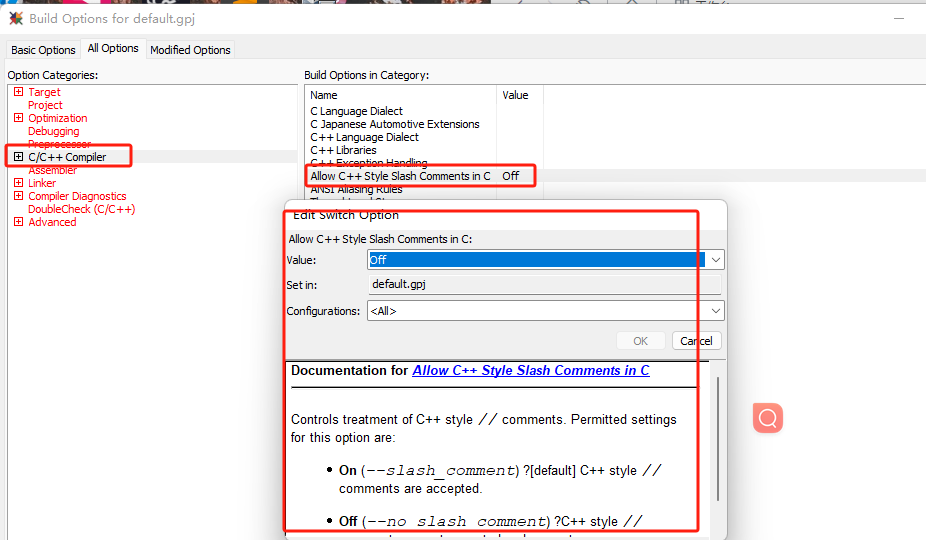2)第二種情況是由于GHS的配置導致的。在build options中有C/C++ Compiler->Allow C++ Style Slash Comments in C的一個配置選項。這個配置選項就是對于C++的注釋風格是否兼容進行配置。(如圖4-2)
