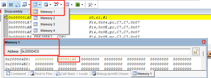 4)、然后,通過圖示的位置打開Memory 1窗口。在Memory 1窗口中的Address中輸入MSP的值(如圖4-4)。在輸出結(jié)果中找到以“08”開頭的地址信息。這個(gè)就是具體代碼的位置。