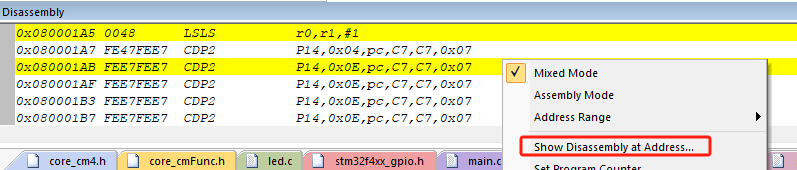 5)、然后,在Disassembly窗口中,右鍵打開菜單找到Show Disassembly at Address(如圖4-5-1),在打開的Show code at Address窗口中以0x為開頭的方式輸入在Memory1中確認(rèn)的地址信息(如圖4-5-2),然后,就可以跳轉(zhuǎn)到對(duì)應(yīng)的代碼位置。然后,根據(jù)跳轉(zhuǎn)的代碼位置去確認(rèn)堆棧溢出的位置即可。