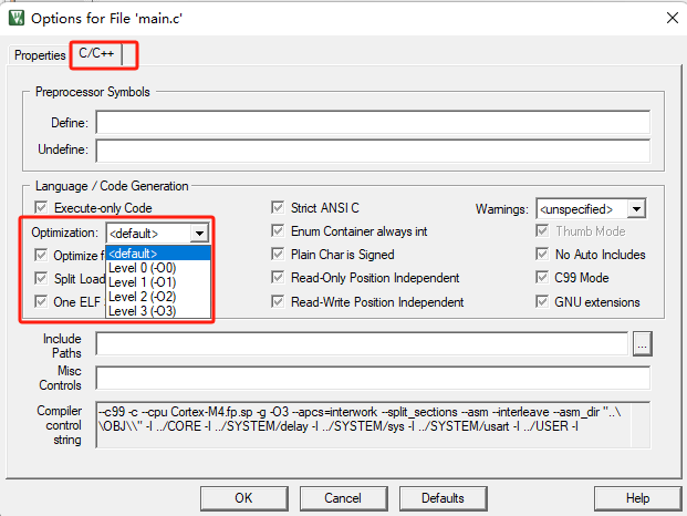 2)、然后,在打開(kāi)的Options for File ‘main.c’窗口中,切換到C/C++欄,在Optimization中去選擇優(yōu)化等級(jí)(如圖4-2)。“<default>”選項(xiàng)是默認(rèn)使用整個(gè)工程采用的優(yōu)化等級(jí)。選擇“Level 0/1/2/3”就是將對(duì)應(yīng)的源文件使用O1/2/3優(yōu)化等級(jí)去進(jìn)行構(gòu)建。