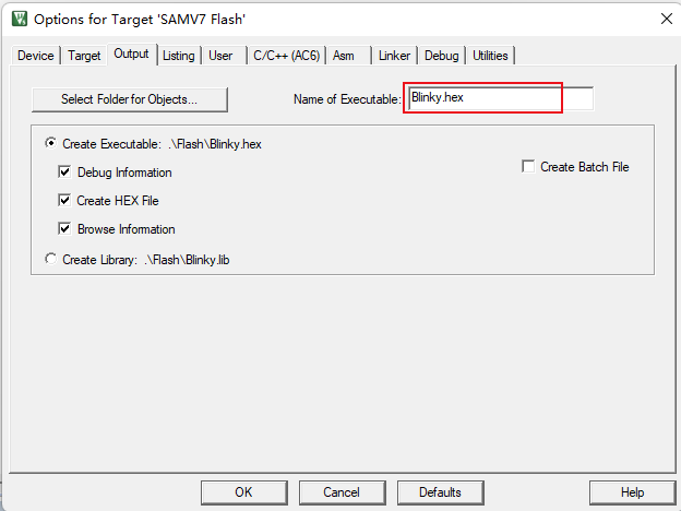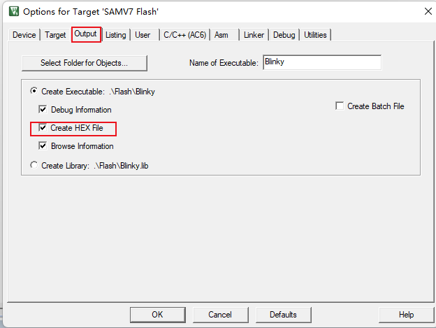 1)、首先,先通過工程的options窗口中的Output欄中去勾選Create Hex File的選項,將Hex文件進行生成出來(如圖4-1)。構建編譯后,就會生成Hex文件,Hex文科默認是在工程目錄下的Flash文件夾中。文件名就是工程名加上hex文件名后綴。
