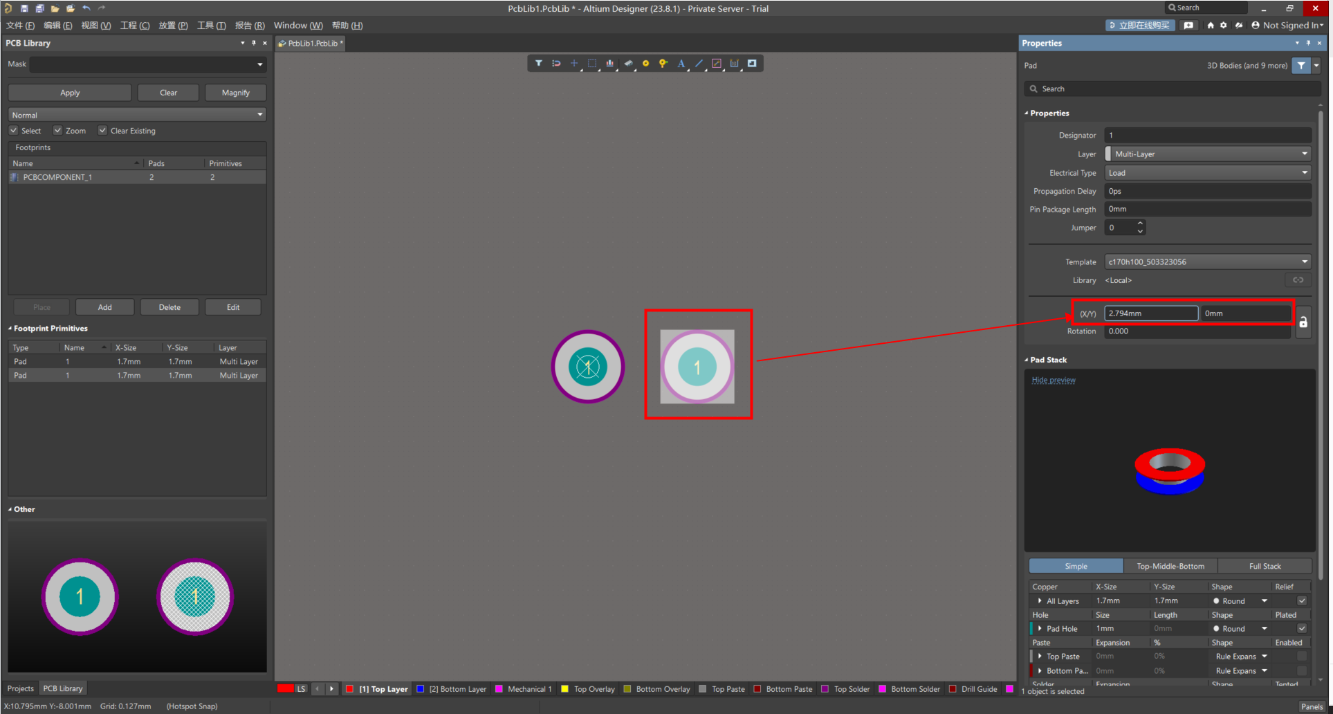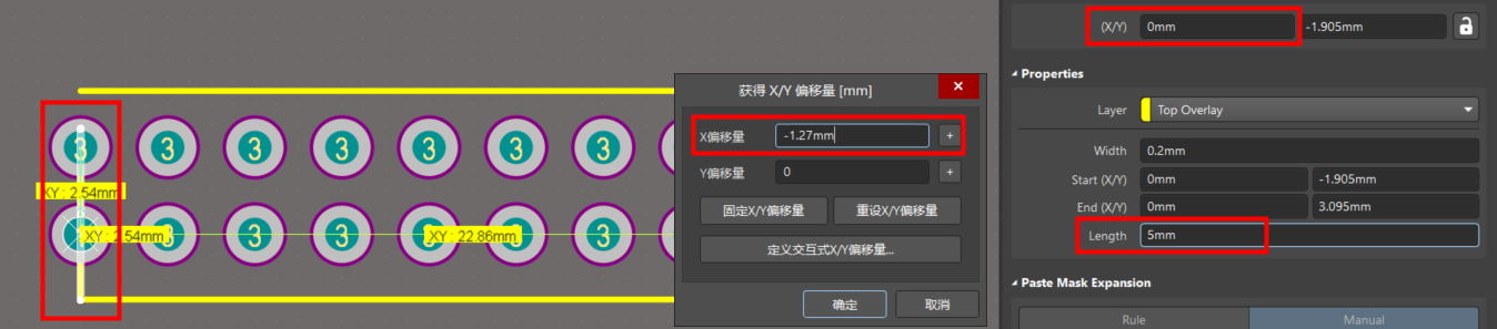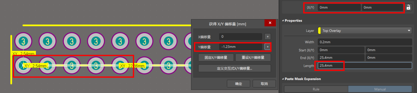 這里只需要將兩個焊盤重合放置,利用位移工具,菜單欄下【編輯】->【移動】->【通過 X,Y 移動選中對象】(快捷鍵 M)