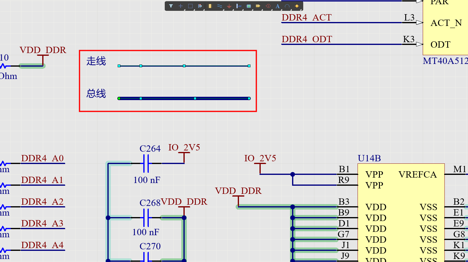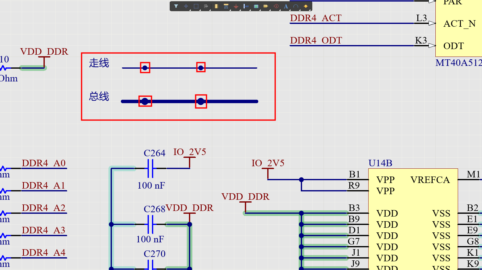 在原理圖中進(jìn)行走線和總線連接時(shí),單根線上沒有進(jìn)行相交就會(huì)出現(xiàn)錨點(diǎn)的現(xiàn)象。