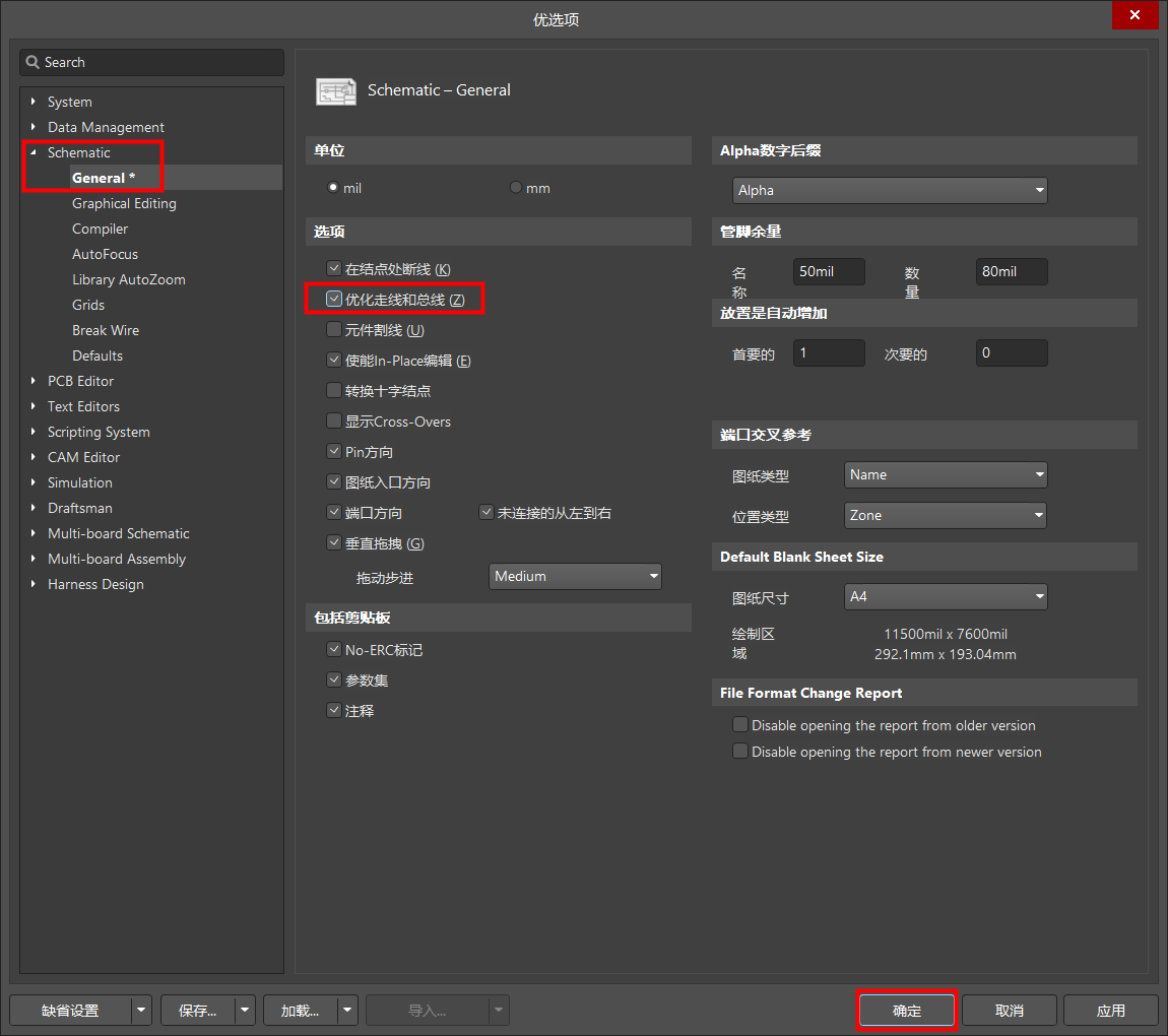 打開【優(yōu)選項(xiàng)】->【Schematic】->【General】,將【優(yōu)化走線和總線】復(fù)選框勾選。點(diǎn)擊【確定】