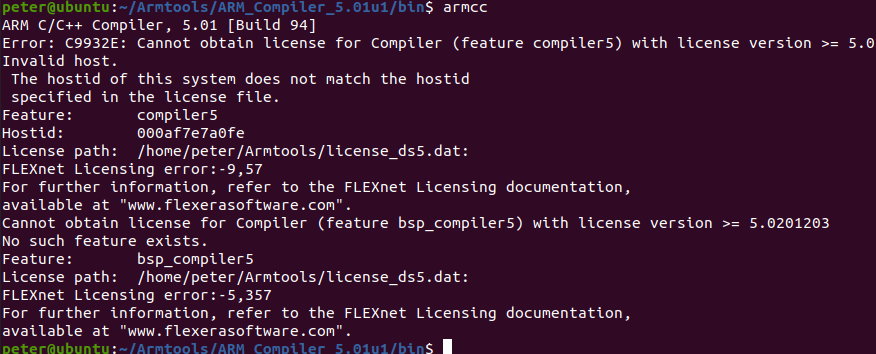 客戶購(gòu)買(mǎi)了DS-5的license授權(quán)后,在Linux環(huán)境下使用Compiler 5.01對(duì)于項(xiàng)目進(jìn)行開(kāi)發(fā)。但是,在使用Compiler 5.01去進(jìn)行編譯的時(shí)候提示:該license不是該主機(jī)的。提示如下圖2-1: