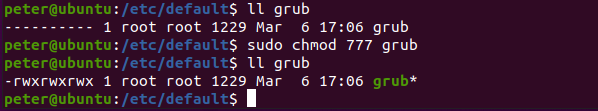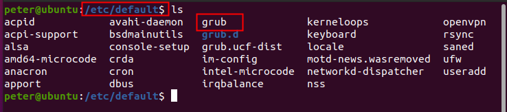 (1)、在Linux環(huán)境下,進(jìn)入到/etc/default目錄下找到grub文件。(如圖4-2-1)