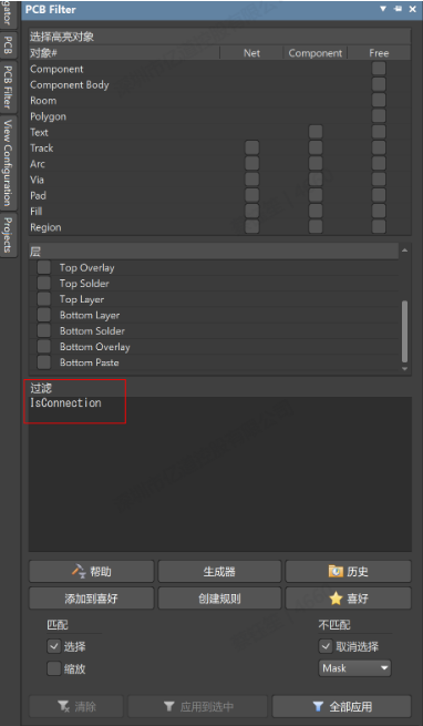 通過PCB Filter可以快速找到未連接的網絡,并且以高亮顯示顯示,方便工程師連接布線。方法很簡單,打開PCB Filter面板,在“過濾”欄直接輸入“IsConnection”。
