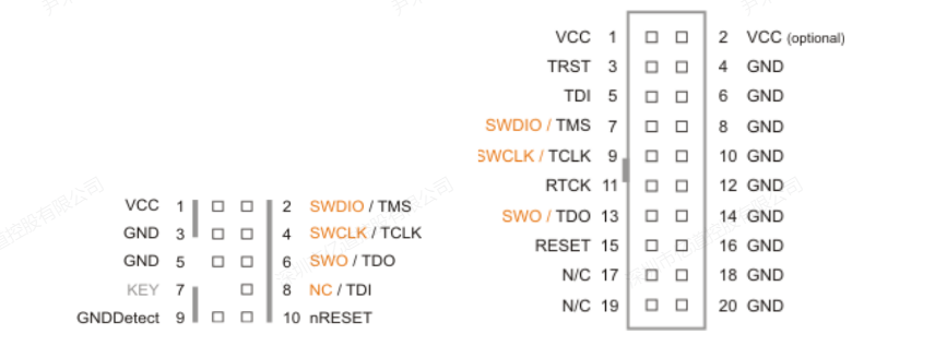 4)、推薦使用標準JTAG(圖2 10pin/20pin)進行調試,當使用四線SWD接口進行調試時,會有一定概率出現這種故障情況。推薦使用ULINK或JLINK等正版調試器。