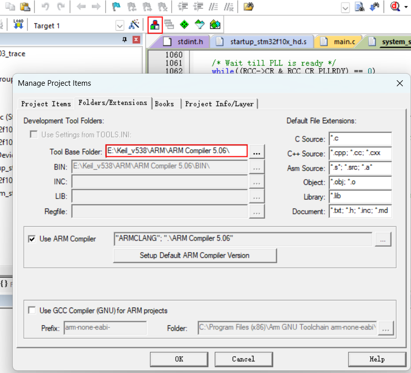 3)、進(jìn)入“Manage Project Items”界面后選擇“Folders/Extensions”, 在Tool Base Folder內(nèi)選相關(guān)的文件路徑,將路徑修改為“E:Keil_v538ARM”后點(diǎn)擊“OK”,再進(jìn)行燒錄可以成功燒錄。