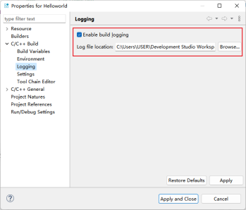 2)、在屬性窗口中,展開“C/ c++ Build”,選擇“Logging”。在Logging中可以看到有一個Enable build logging的選項,勾選上就會在Build后會自動生成build log文件。在下面還可以指定log文件的存儲路徑(如圖2)。