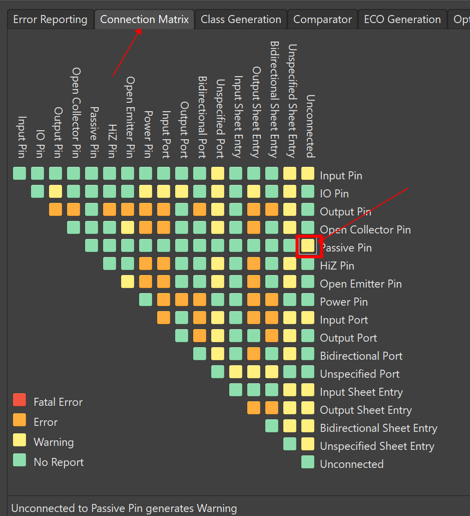 2)、在Connection Matrix中找到Unconnected和Passive對(duì)應(yīng)的一格,可以看到AD默認(rèn)是綠色的即不報(bào)錯(cuò)(No Report)。將其改為警告(Warning)或者報(bào)錯(cuò)(Error)。