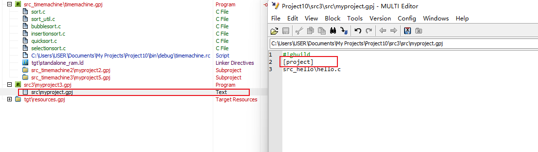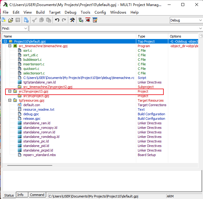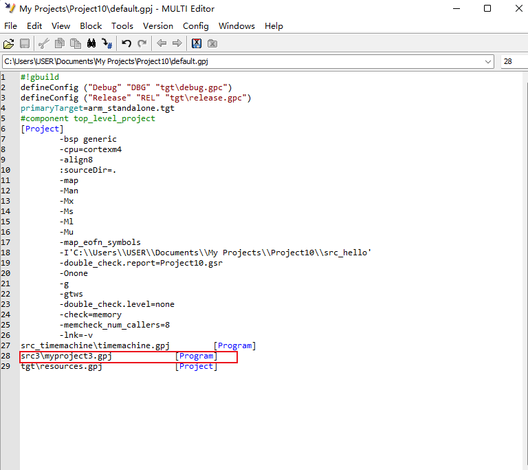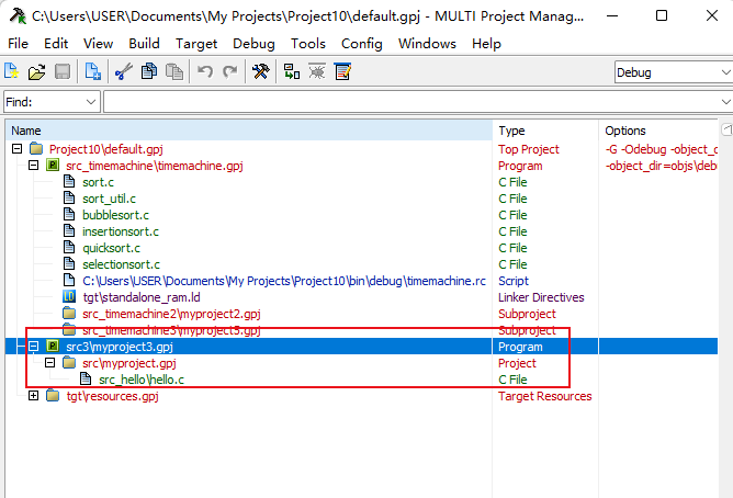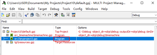 3)、修改后的結果如圖4-3所示,可以看到myproject3.gpj的文件類型從Project改成了Program。但是,可以從圖2-1中看到myproject3.gpj下面的還有一級目錄srcProject.gpj不見了。這個是因為,myproject3.gpj的上一級工程文件default.gpj文件中myproject3.gpj的文件類型還是Project,所以導致,myproject3.gpj下一級的內容丟失了。