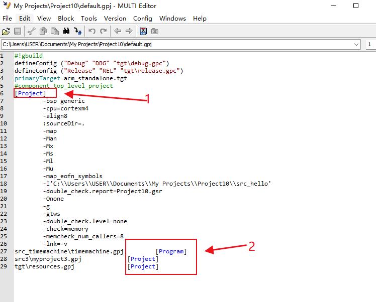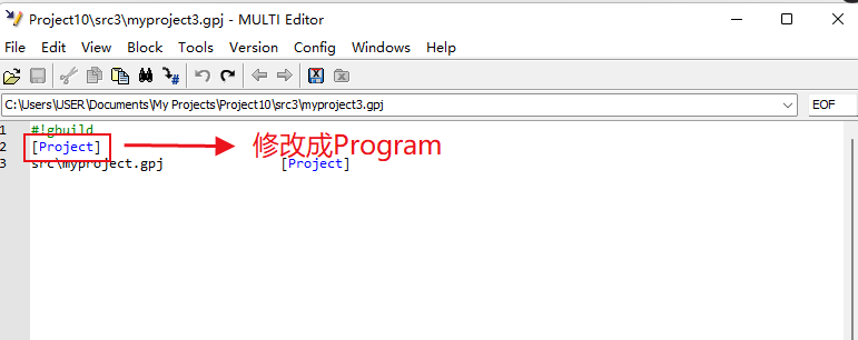 2)、想要將myproject3.gpj文件的類型改成Program類型。首先,打開myproject3.gpj文件后,將里面的【Project】修改成【Program】。注意首字母一定要大寫,否則是無法識別文件類型的。(如圖4-2)