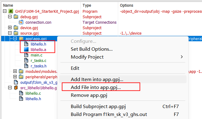4)、回到工程管理界面,選中調用的函數工程gpj文件,點擊右鍵,"Add File into app.gpj..."如圖添加文件。