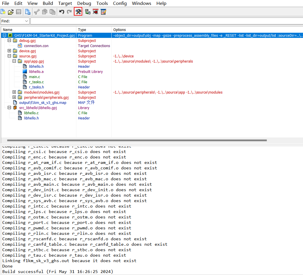 1)、本次采用工程為瑞薩官方例程、Y-ASK-RH850F1KM-S4-V3_sample_V101、打開項目工程,選擇項目編譯成功。點擊如圖添加文件快捷鍵、或者點擊"Edit"再點擊"Add ltem into F1KM-S4 Starterkit Project.gpj...",“Create New ...”內選擇與“Hello World LIbrary” 對應的C/C++語言或創建“Library”無示例工程。