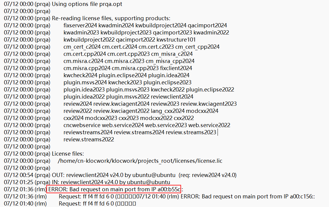 2)、在服務器的projects_root/license.log 文件內,查找到相關的報錯原因,網絡IP連接有誤。