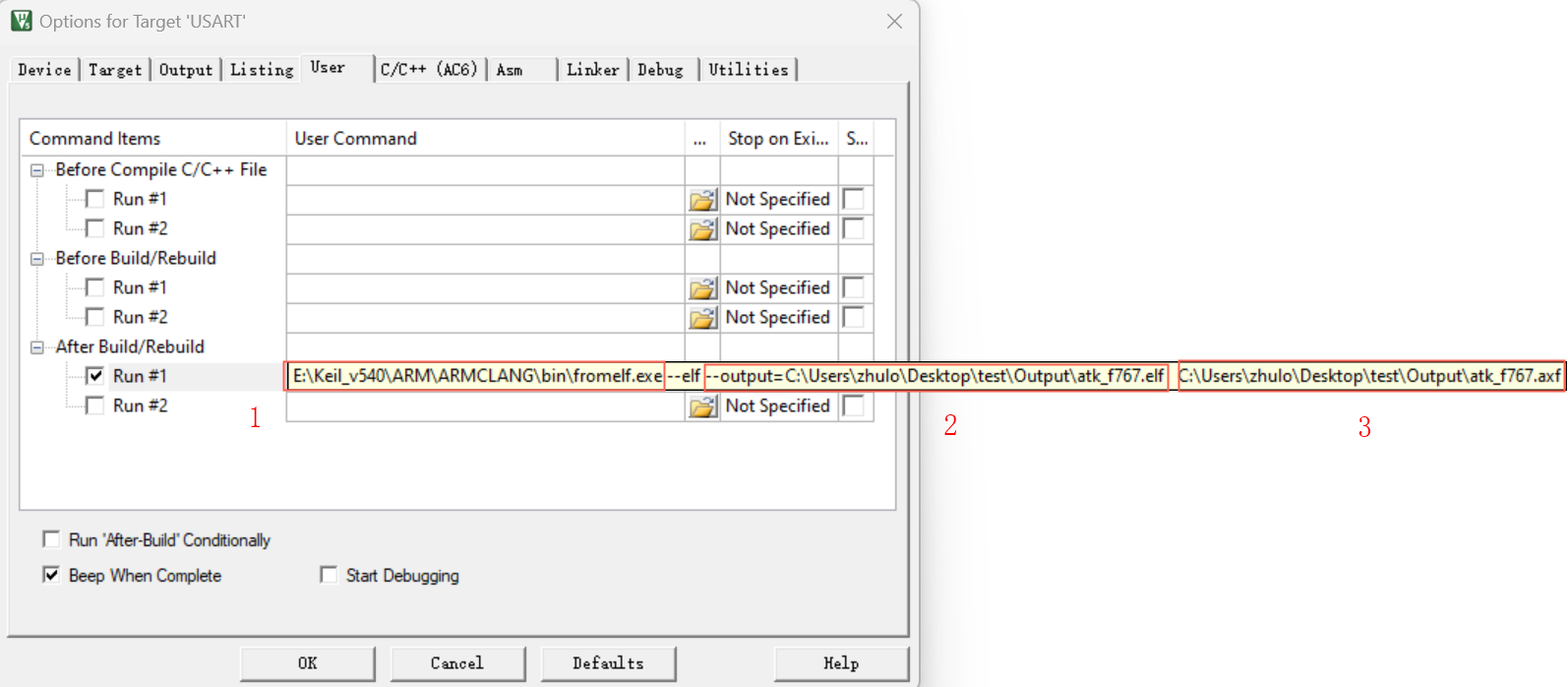 2)、在User界面選擇“After Build/Rebuild”勾選“Run#1”, 在執(zhí)行框內(nèi)輸入如下命令E:Keil_v540ARMARMCLANGbinfromelf.exe --elf --output=C:UserszhuloDesktoptestOutputatk_f767.elf C:UserszhuloDesktoptestOutputatk_f767.axf