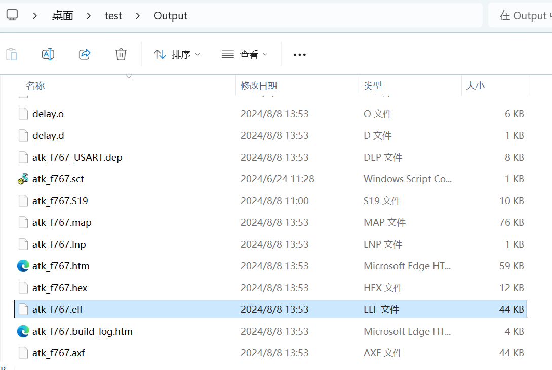 3)、點(diǎn)擊編譯后,在相應(yīng)的文件夾下生成atk_f767.elf文件。