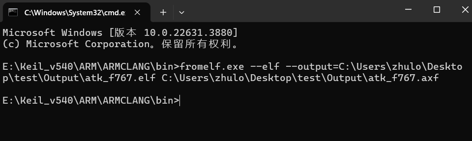 “C:UserszhuloDesktoptestOutputatk_f767.axf” 指定輸入文件路徑。