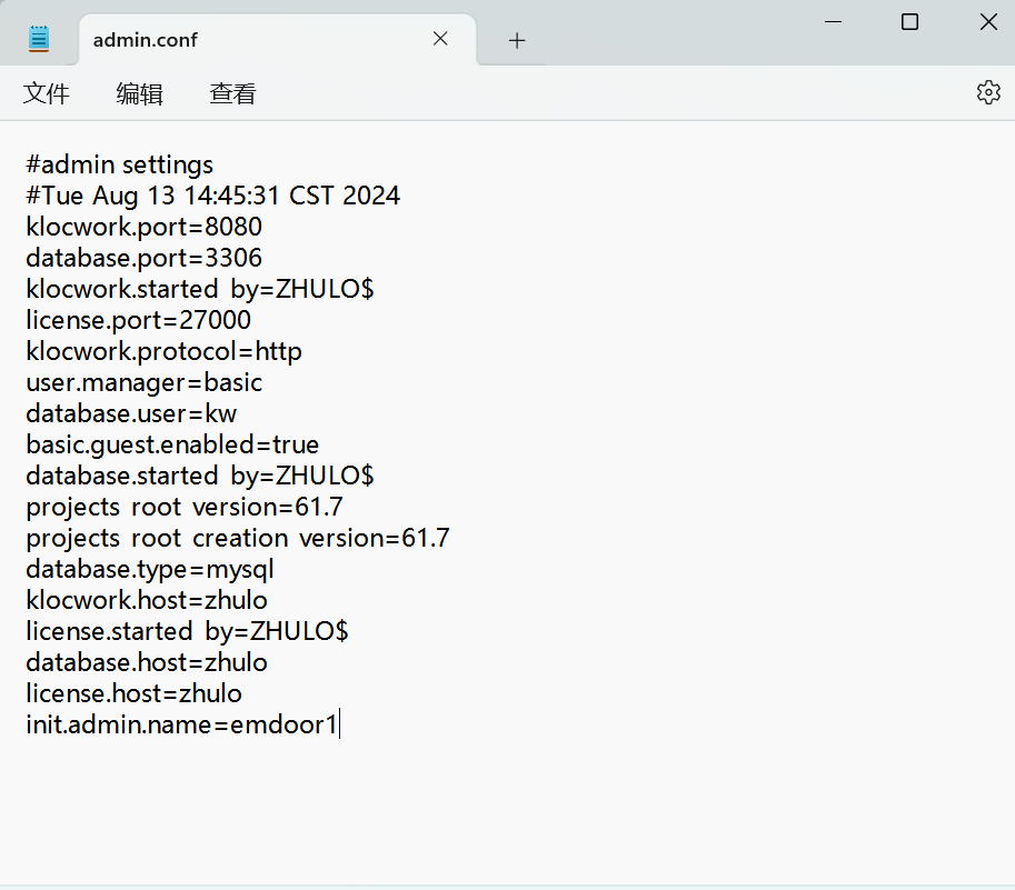 2)、設置臨時管理員,在admin.conf文件末端編輯,加上<init.admin.name=emdoor1>(本例臨時管理員為emdoor1)