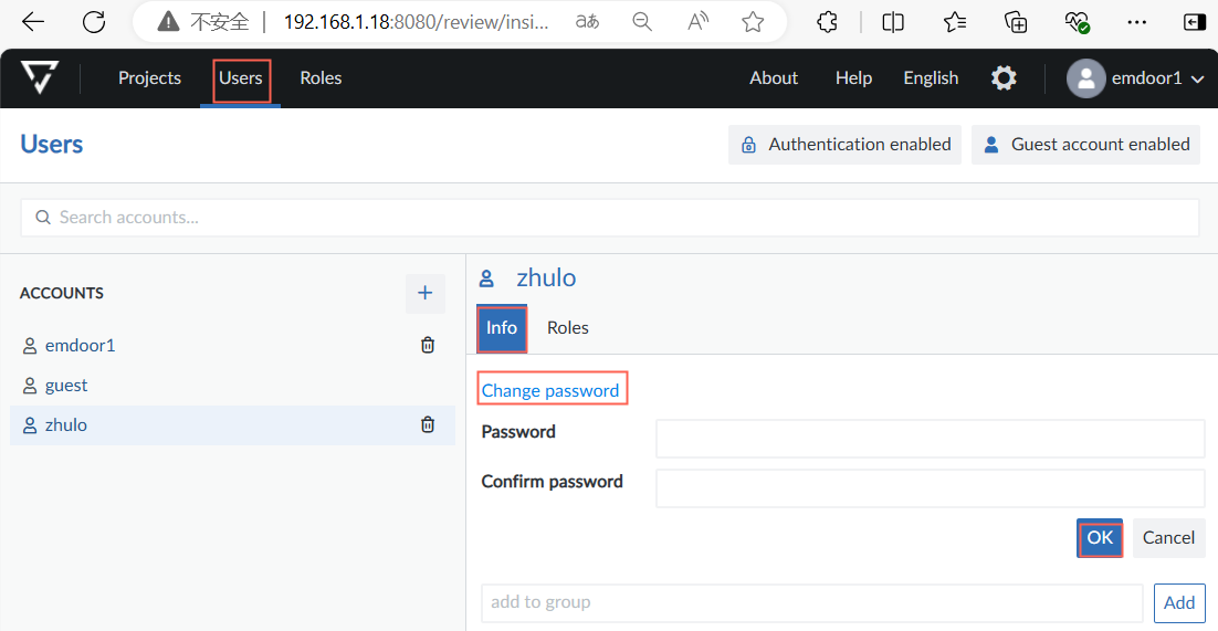 4)、在Validate界面登入臨時管理員賬戶,點擊Users、點擊原管理員賬戶、再點擊Info、Change password,