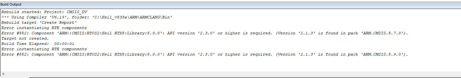 用戶在Pack包中打開一個示例工程,打算熟悉一下對應芯片的功能和軟件的功能,但是,打開軟件后,在構建信息輸出框中提示:“Error #552: Component 'ARM::CMSIS:RTOS2:Keil RTX5:Library:5.9.0': API version '2.3.0' or higher is required. (Version '2.1.3' is found in pack 'ARM.CMSIS.5.9.0').”