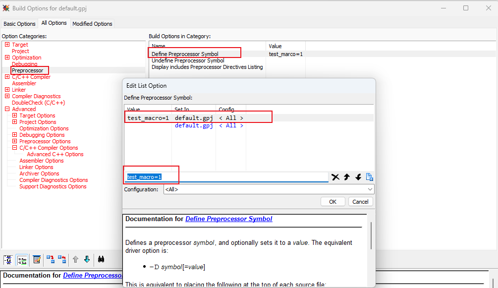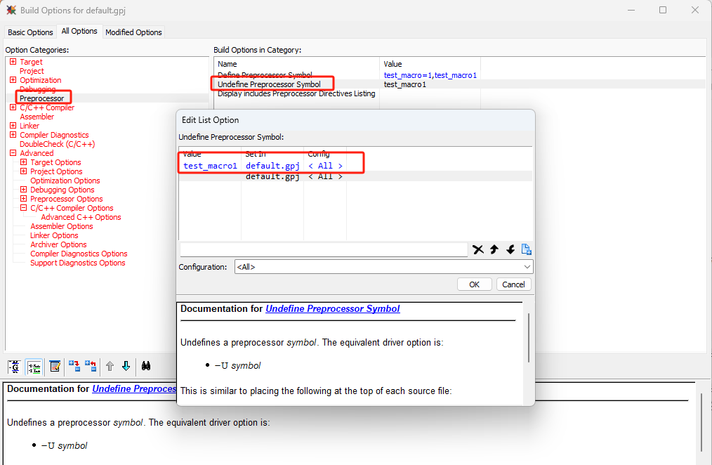 4)、如果想取消宏定義,也可以在build options中的Preprocessor->Undefine Preprocessor Symbol中進行取消宏定義的操作。該配置等同于語法“#undef”。(如圖4-3)