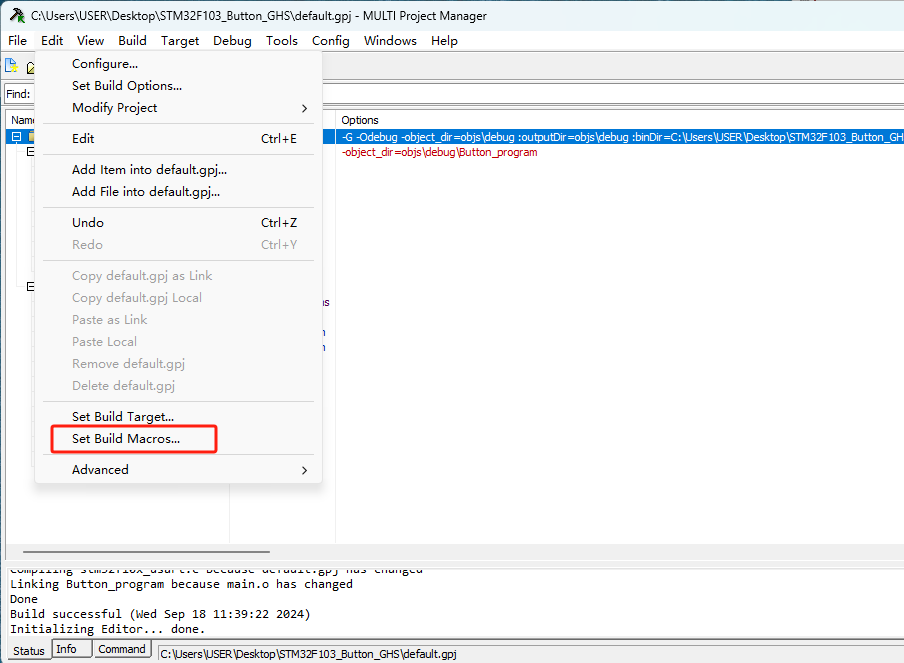 1)、在GHS的Multi Project Manager窗口的Edit菜單中有一個Set Build Macros的選項。(如圖4-1)