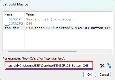 3)、示例:在工程下,我的所有頭文件都在“C:UsersUSERDesktopSTM32F103_Button_GHS”路徑下面,這個是根路徑(如圖4-3)。通過通配符的定義,將配置文件中所有的“C:UsersUSERDesktopSTM32F103_Button_GHS”都用通配符替代。(如圖4-4)