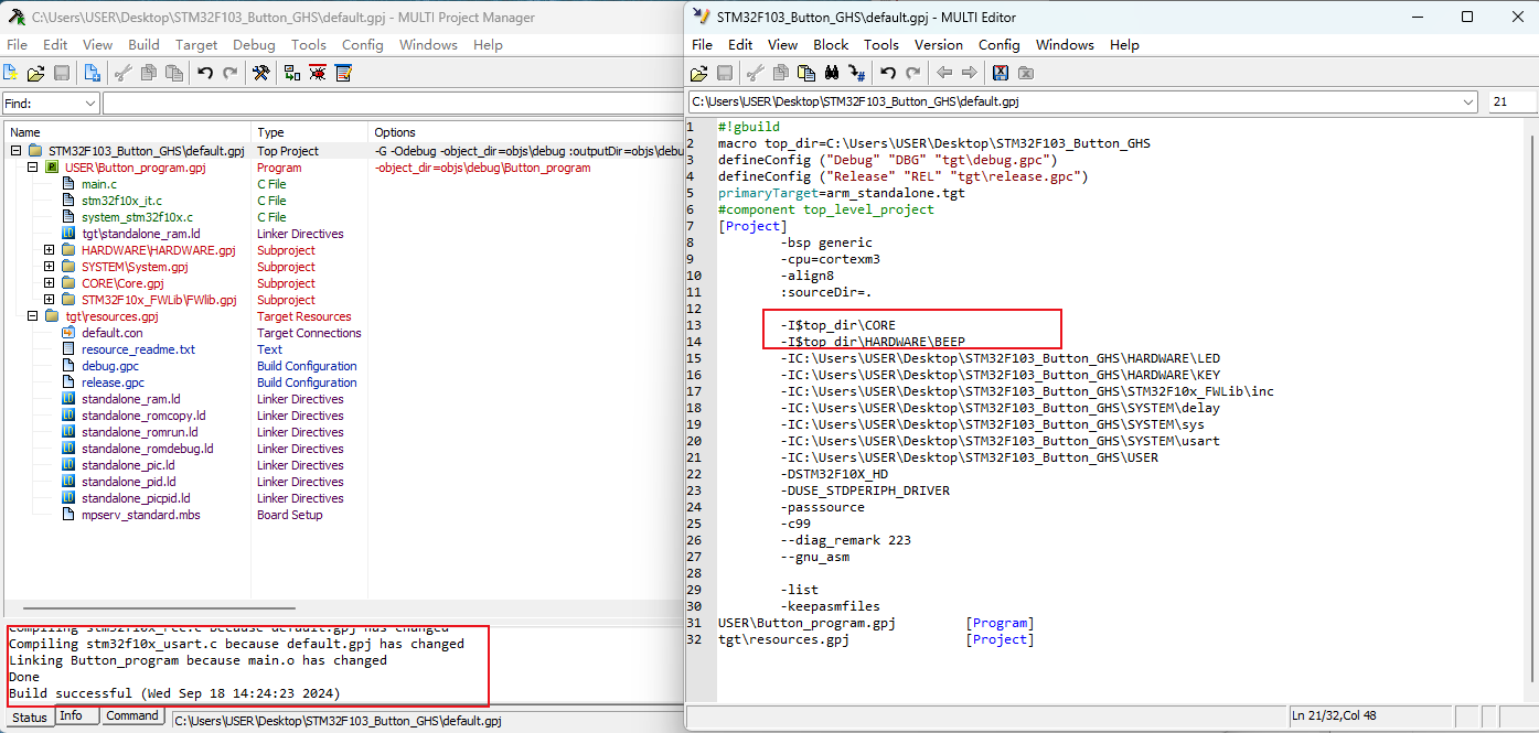 4)、配置好后,我就可以將我的配置文件中的“C:UsersUSERDesktopSTM32F103_Button_GHS”替換成“$top_dir”(,重新構建后,顯示構建成功。如圖4-5)