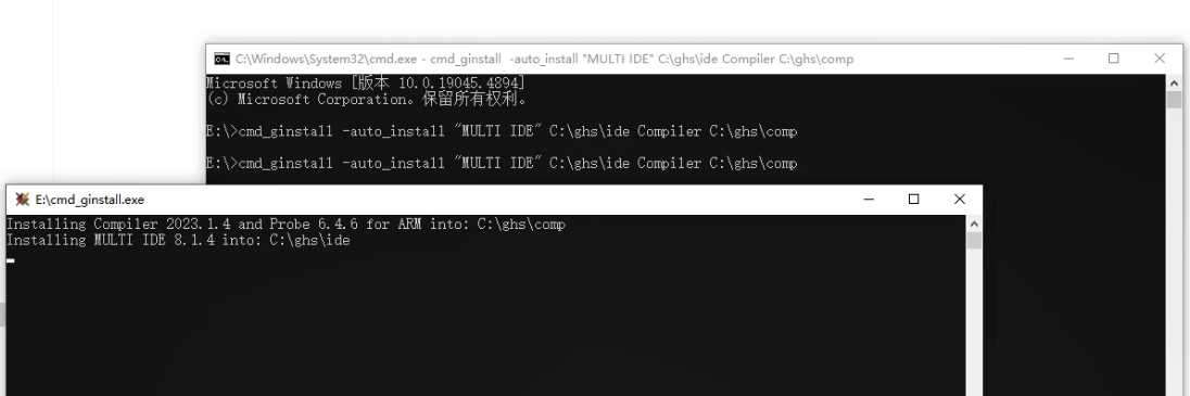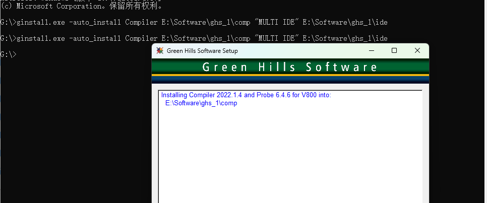 Windows:cmd_ginstall -auto_install Compiler E:Softwareghs_1comp "MULTI IDE" E:Softwareghs_1ide