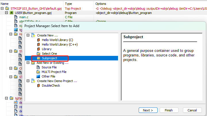1)、首先,創(chuàng)建好工程后,需要創(chuàng)建好一個Subproject(子工程)來對于源文件進(jìn)行存放。(如圖4-1)