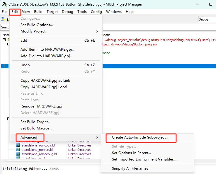 2)、創(chuàng)建好Subproject后,選中創(chuàng)建好的Subproject,在菜單欄中選擇Edit->Advanced->Create Auto-Include Subproject。(如圖4-2)
