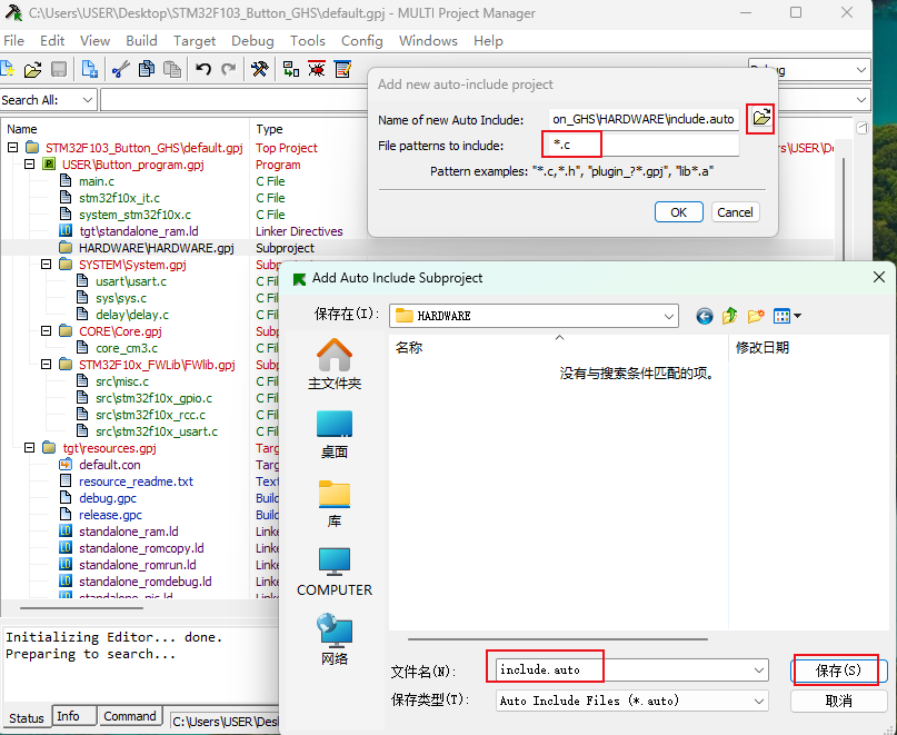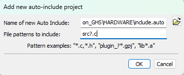 6)、如果在工程目錄下,想要導(dǎo)入具有統(tǒng)一命名格式的文件,例如:src1.c、src2.c、src13.c這樣的。可以在Add new auto-include project窗口中的File patterns to Include中輸入"src?.c"。(如圖4-6-1)用“?”表示通配符,只要是src開頭的C文件都會導(dǎo)入進(jìn)來。(如圖4-6-2)