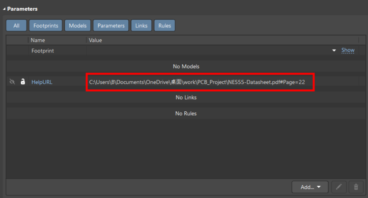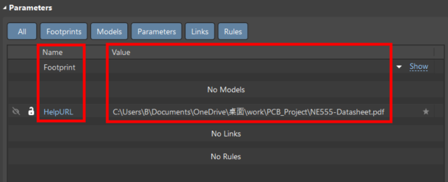 給元器件添加 Datasheet PDF 路徑,需要確定的是 Datasheet PDF 路徑不能發生改變,需要變更的話,同時 URL 進行修改。