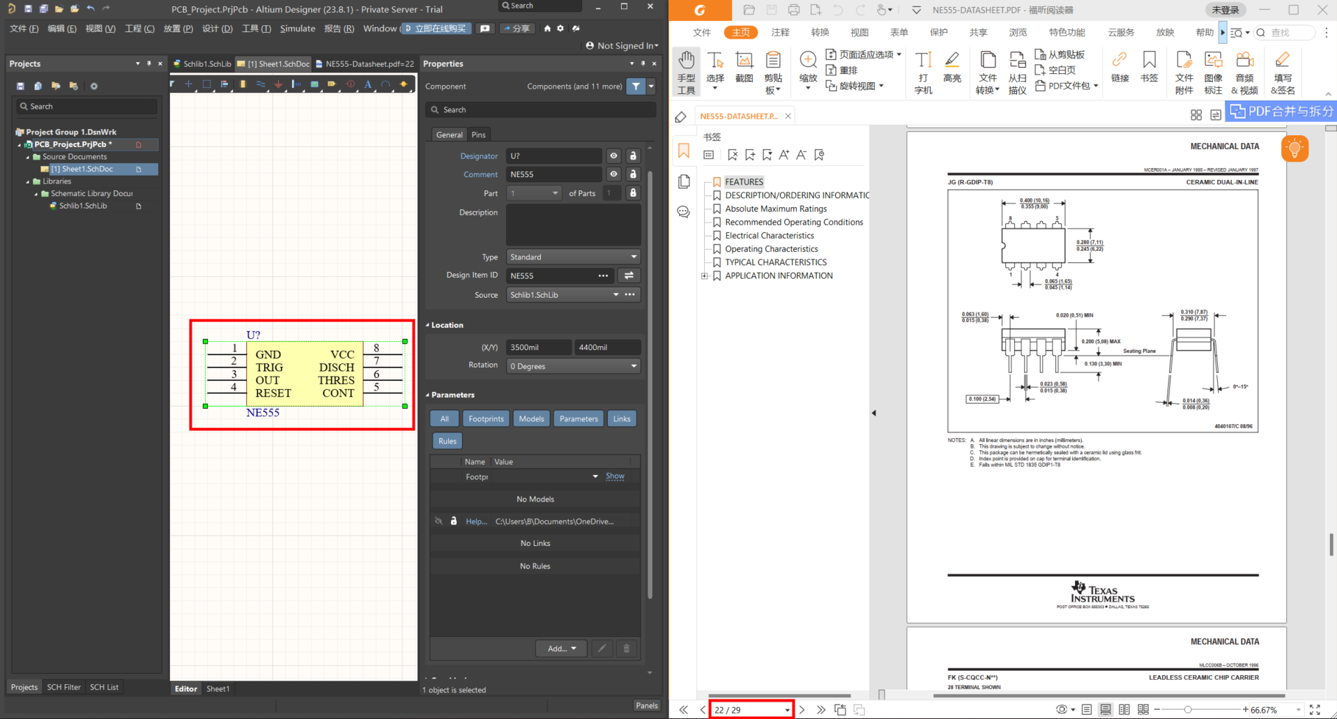 打開原理圖庫文件,找到想添加的芯片的原理圖,我們以 NE555 為例: