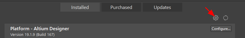 在 Altium Designer 中,轉到"擴展和更新"。點擊齒輪圖標