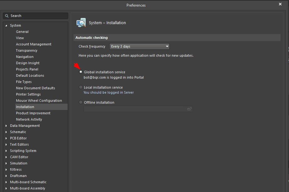 更新首選項選擇“System → Installation”,選擇“Global installation service”,需登錄 Alitum 賬號,然后單擊“確定”。這樣就可以重新獲取最新的擴展和更新。