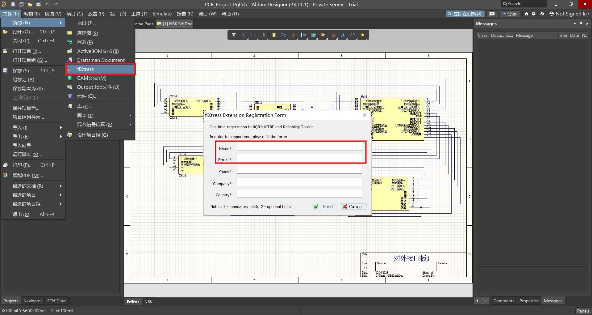 要啟動擴展,請打開一個項目和一個原理圖。當原理圖可見時,選擇文件 → 新建fiXtress