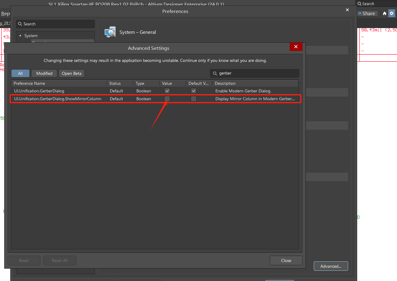 找到【UI.Unification.GerberDiog.showmirrorColumn】,并勾選Value檢查框,重啟軟件。