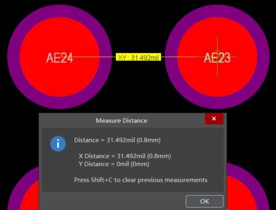 ○ 按快捷鍵 Ctrl+M 測量 BGA 焊盤中心間距,以確定扇出所用過孔尺寸。
