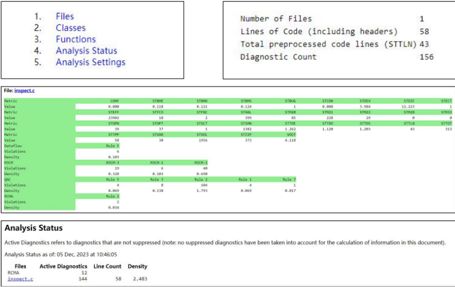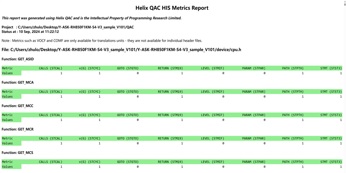 生成html文件,顯示HIS測試報告,根據(jù)ASPICE(Automotive SPICE)中的HIS(Hersteller Initiative Software?)標(biāo)準(zhǔn),共12個度量元指標(biāo)。