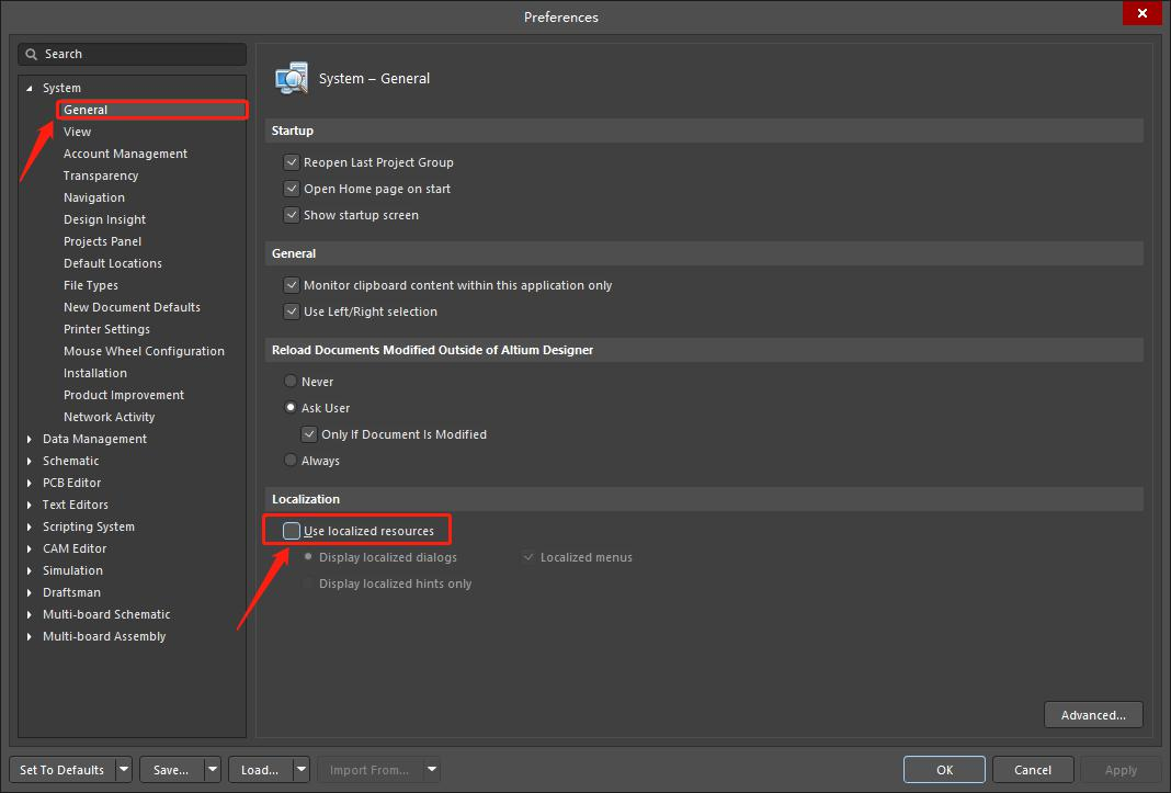 2 打開 Preference 對話框,展開 System 菜單,選擇 General 選項,勾選 Use localized resources 復選框,然后單擊 Apply 按鈕再單擊 OK 按鈕。