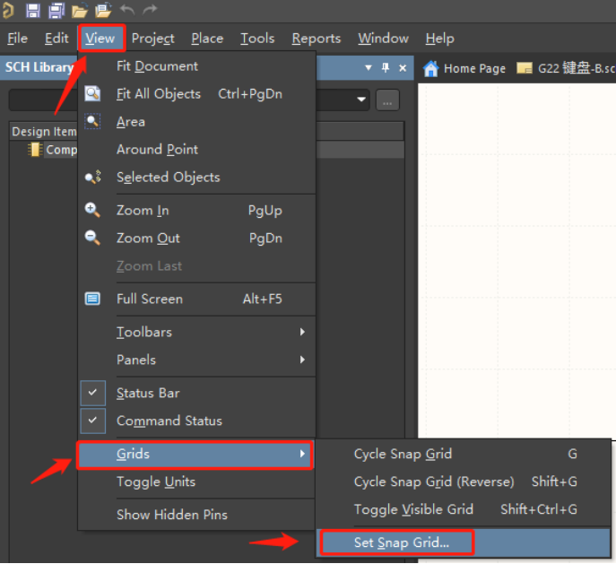 在原理圖庫(kù)編輯界面按快捷鍵G,可在10mil/50mil/100mil之間循環(huán)切換。