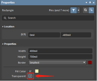 結(jié)局方法2:使用鼠標(biāo)左鍵雙擊已經(jīng)放置的矩形框,在彈出的Properties面板的對(duì)話框中勾選Transparent復(fù)選框,使得矩形框透明化,顯示管腳信息。