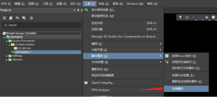 執行菜單欄中的“工具”--> “器件擺放”-->“交換器件”,即可實現元件的交換。